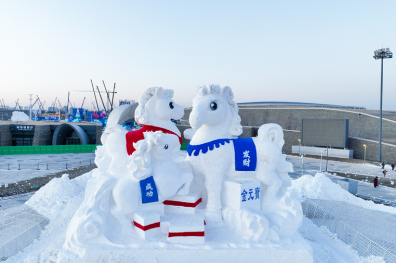 12月7日,备受关注的主题雪雕“童话小马一家”雕刻完成,明日,雪雕匠人们将为“一家四口”穿上巨型彩色服饰,缀以“马上发财”“马上幸福”等吉祥祝福语,将这份冰城的温暖期许传递给每一位游客。