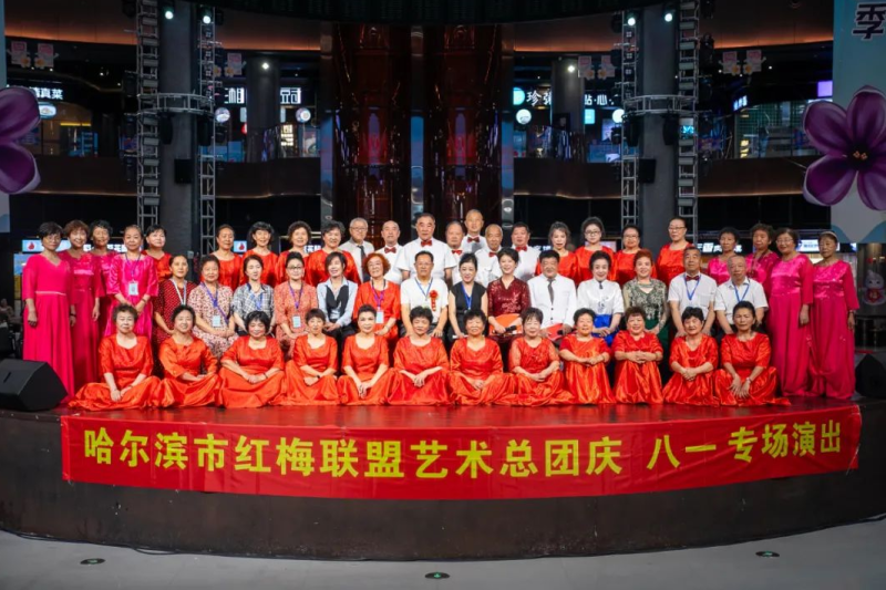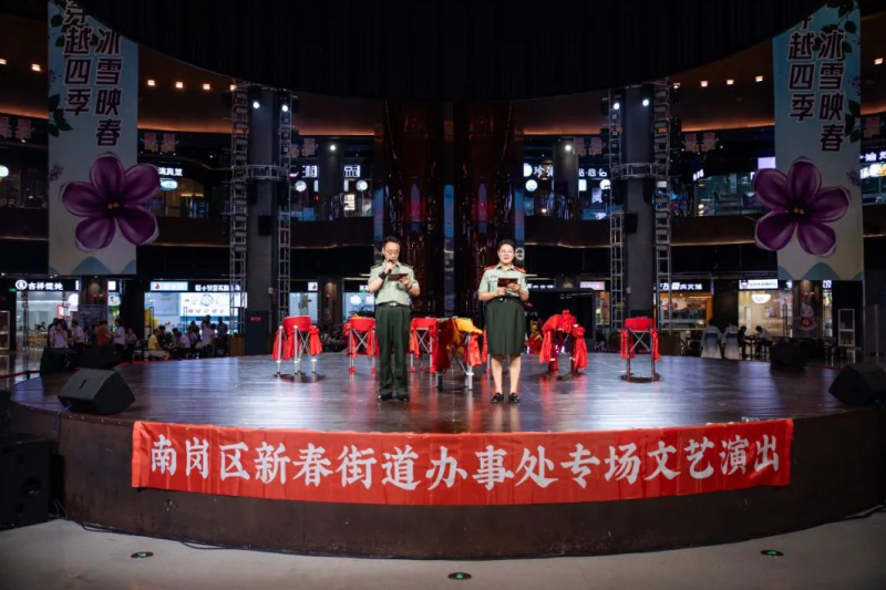 7月26日,南岗区新春街道办事处在哈尔滨冰雪大世界冰雪美食馆中心舞台举办“情暖八一 · 致敬最可爱的人” 专场文艺演出。此次演出的演员们是来自各社区及哈尔滨市老年志愿者协会艺术团的表演者们。