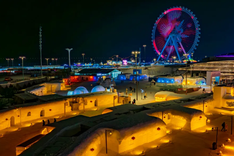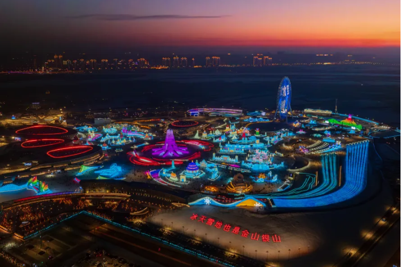 12月29日晚,哈尔滨冰雪大世界园区灯火辉煌、人声鼎沸,来自世界各地的数万名游客齐聚,共享冰情雪韵。