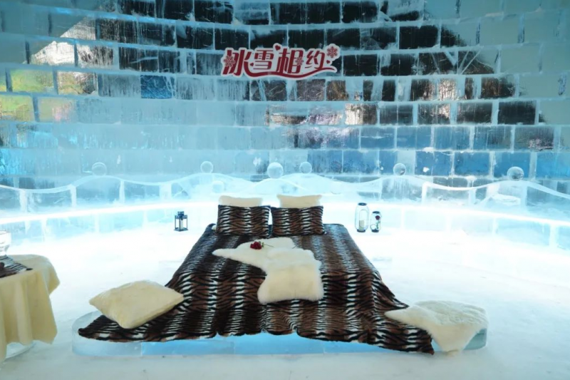 冰屋里吃火锅、冰酒吧里微醺、冰床上睡觉!3D复合冰造“天空之舞”大冰屋,游客在里面体验全套服务。