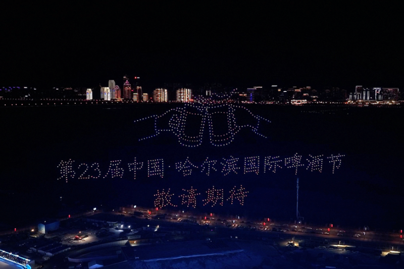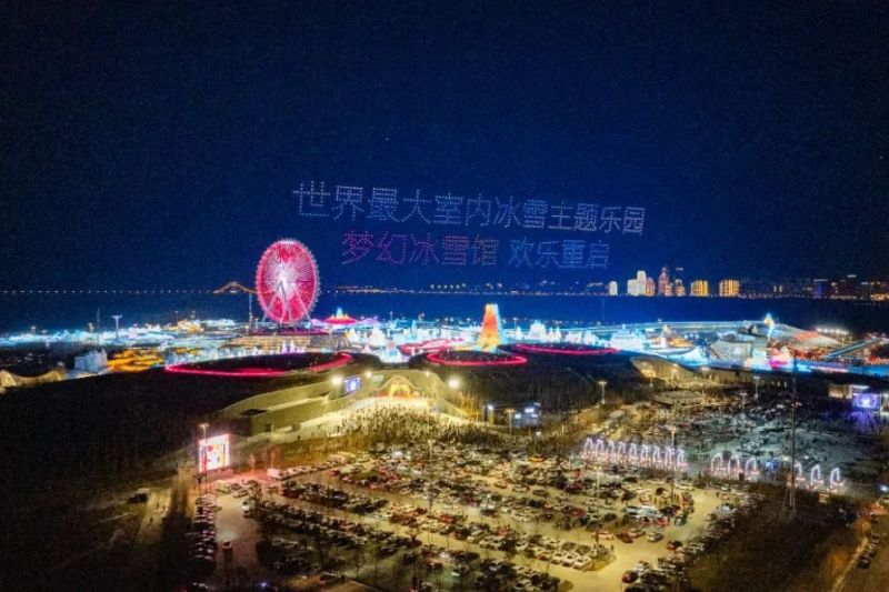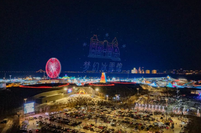 夜幕降临,哈尔滨冰雪大世界的上空绽放出璀璨光芒。千架无人机在四季项目场馆上空编织出梦幻图案,为游客呈现出一场震撼的视觉盛宴。