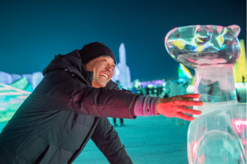 今年冬天衣大哥带着家人, 第一次走进了冰雪大世界, 第一次看到了园区里的冰雕, 第一次面对冰雕发出感叹, “真漂亮这么些年我头一次进来”。